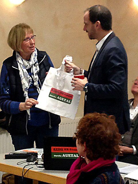 Gudrun Melicchio überreicht am 27.02.2020 im Dorfgemeinschaftshaus Bernsen an Herrn Maik Beermann MdB eine selbstgefertigte Stofftasche und eine Tasse mit dem Aufdruck „Keine ICE-Trasse durchs Auetal“.